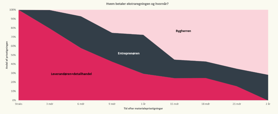 Over tid tager bygherren en stadigt større del af regningen. Efter 9 måneder har han overtaget 25 procent, efter 15 måneder 55 procent, efter to år 72 procent. Andelen vokser, fordi kontrakter udløber og genforhandles, fordi tabsaversionens periode af goodwill hos kunderne slutter, og fordi producenternes strategiske tålmodighed har en grænse. Men bygherrens villighed til at betale afhænger af efterspørgslen. Så længe der er købere i kø, og der er et opsparet boligbehov efter flere års lave igangsætninger, bliver prisstigningen absorberet. Regningen ender der, indtil det ikke længere kan betale sig at bygge nyt.