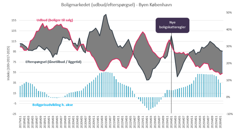 Fundamentet under det københavnske boligmarked er en basal ubalance: Efterspørgslen overstiger strukturelt udbuddet af boliger. Det afspejles i prisen. Op til overgangen i 2024 så vi en voldsom, men forudsigelig stigning i efterspørgslen, da købere fremskyndede overtagelser, så de kunne nå at inkassere en skatterabat. Som forventet faldt efterspørgslen umiddelbart efter for blot at normalisere sig og genoptage en stabil vækstrate. Det var den nemmeste effekt at identificere og forudsige, så det var det, der fyldte i aviserne. Det fremgår også af udviklingen i den sorte kurve i ovenstående figur.
